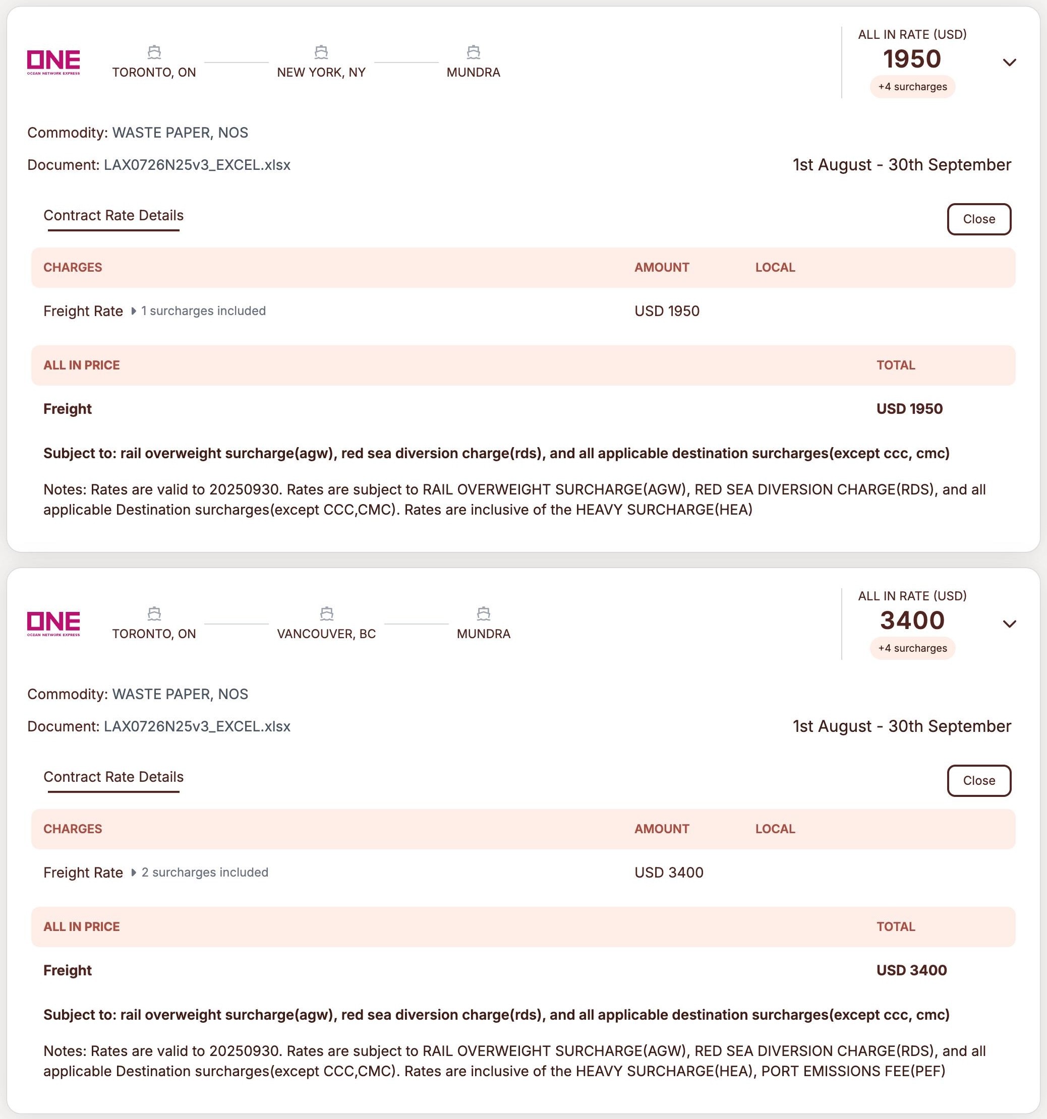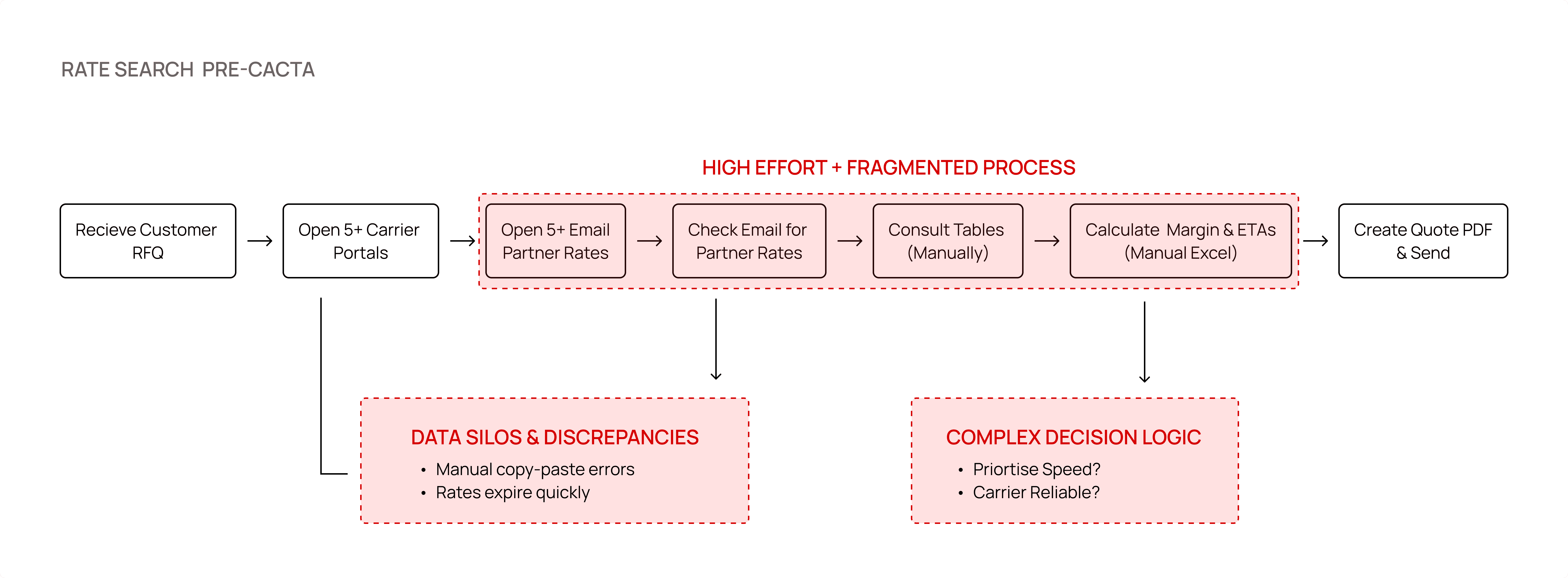 The Fragmented Core: Spot prices (live market) and Contract prices (pre-negotiated) lived in silos. Comparing them required manual Excel calculations for surcharges, leading to frequent "revenue leakage" from missed fees.