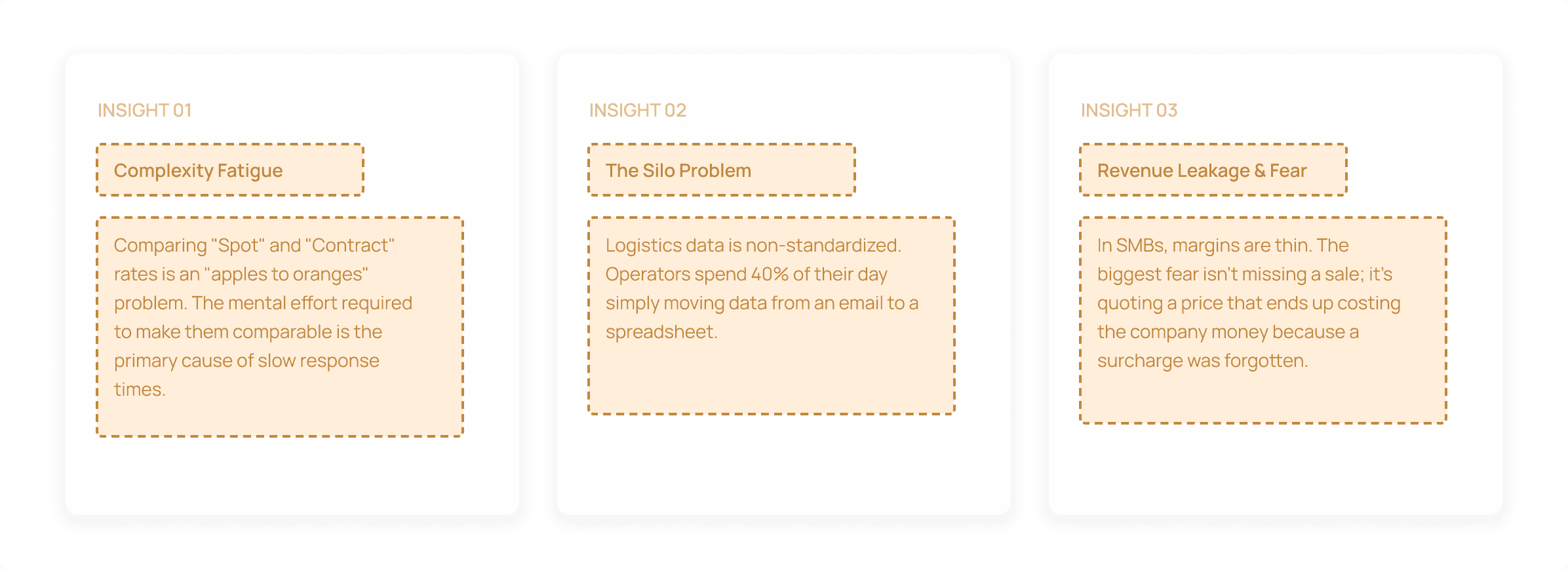 I identified the SMB Operator as our primary user because they act as the "Human API". This person manually bridges the gap between carrier data and customer quotes.
