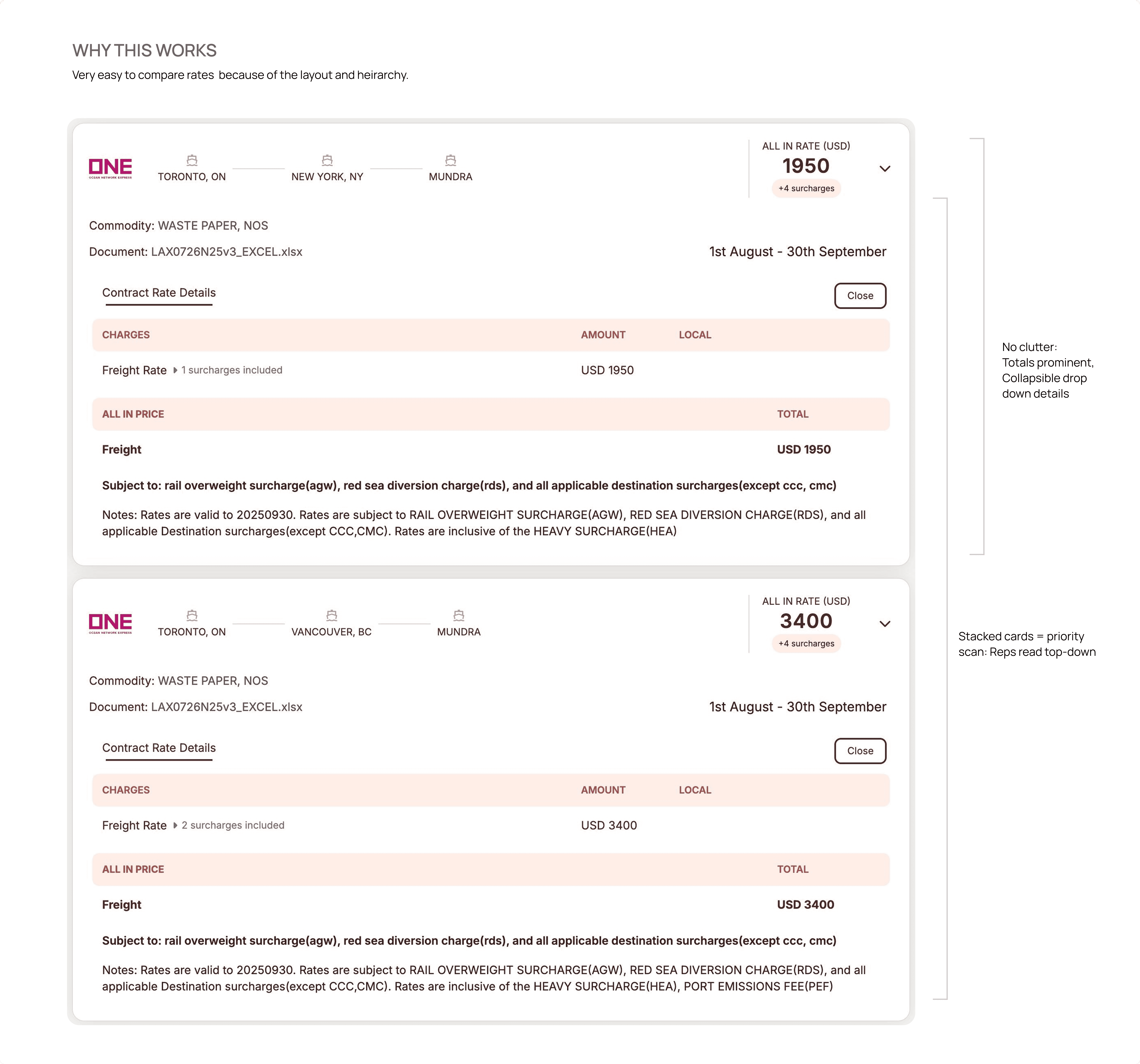I designed a logic-heavy sidebar that pulls line items like BAF (Bunker Adjustment Factor) and Peak Season Surcharges automatically.