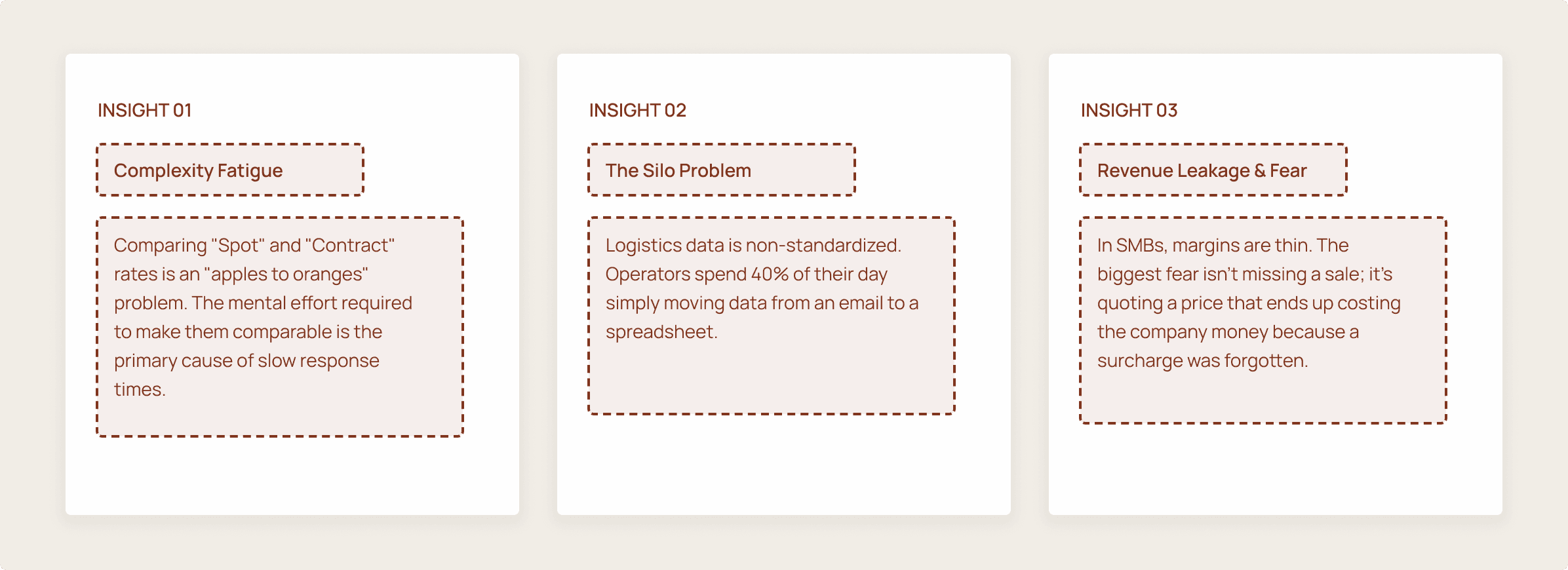 My first instinct was to simplify the UI. Freight is complex, so the interface should be clean, right? Wrong. After research, I realized experts navigate complexity through density, not despite it. The pivot from "clean" to a "High-Density Command Center" was the most important design decision of the project. Expert interfaces shouldn't be simplified. They should be organized.