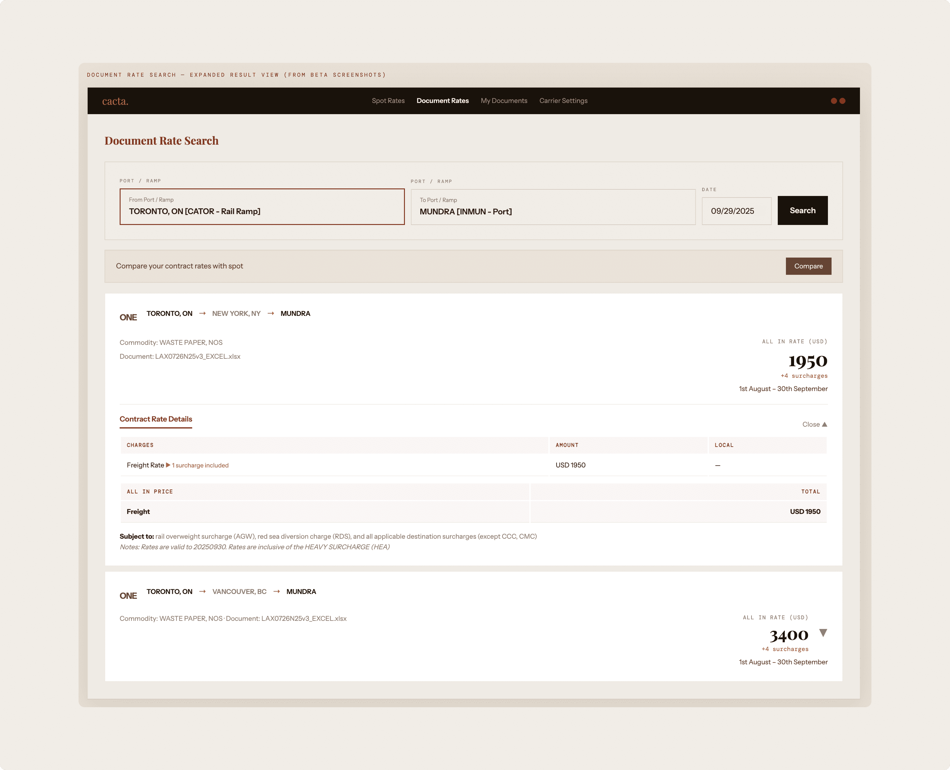 Cacta.ai is a B2B SaaS platform. It allows SMB freight forwarders to compare spot and contract rates from multiple carriers in one place. The goal sounds simple: find the cheapest rate from Toronto to Mundra. In reality, it required unifying a maze of carrier APIs, Excel sheets, surcharge logic, and validity dates into one interface for small teams.