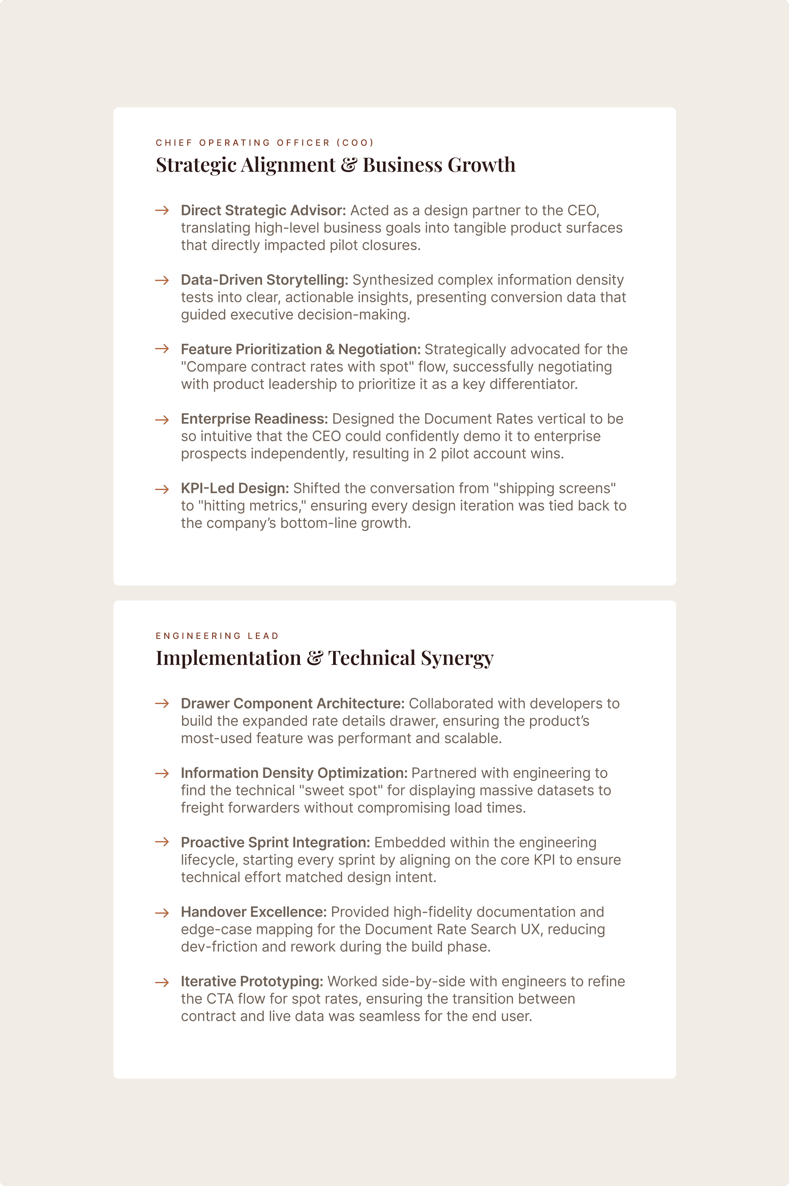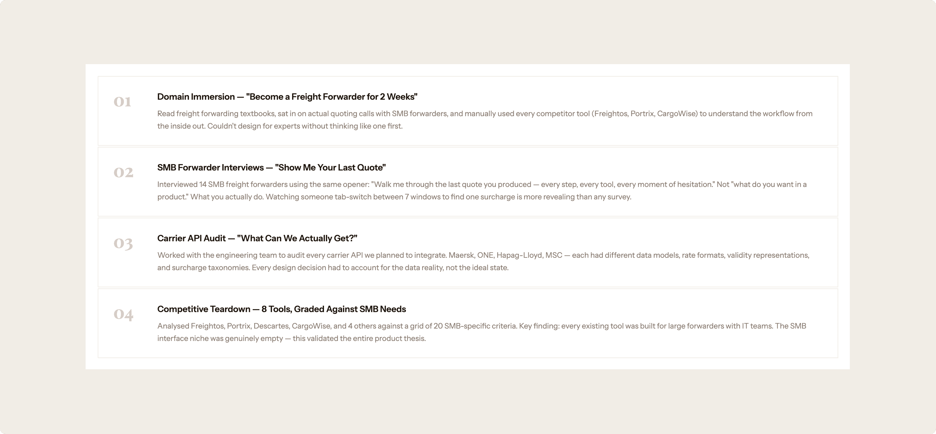 Spending two weeks learning freight forwarding before touching a design tool felt like a risk on a 12-week timeline. It was actually the opposite. Every stakeholder conversation and engineering handoff was faster because I spoke the language. You cannot design for experts without learning to think like them.