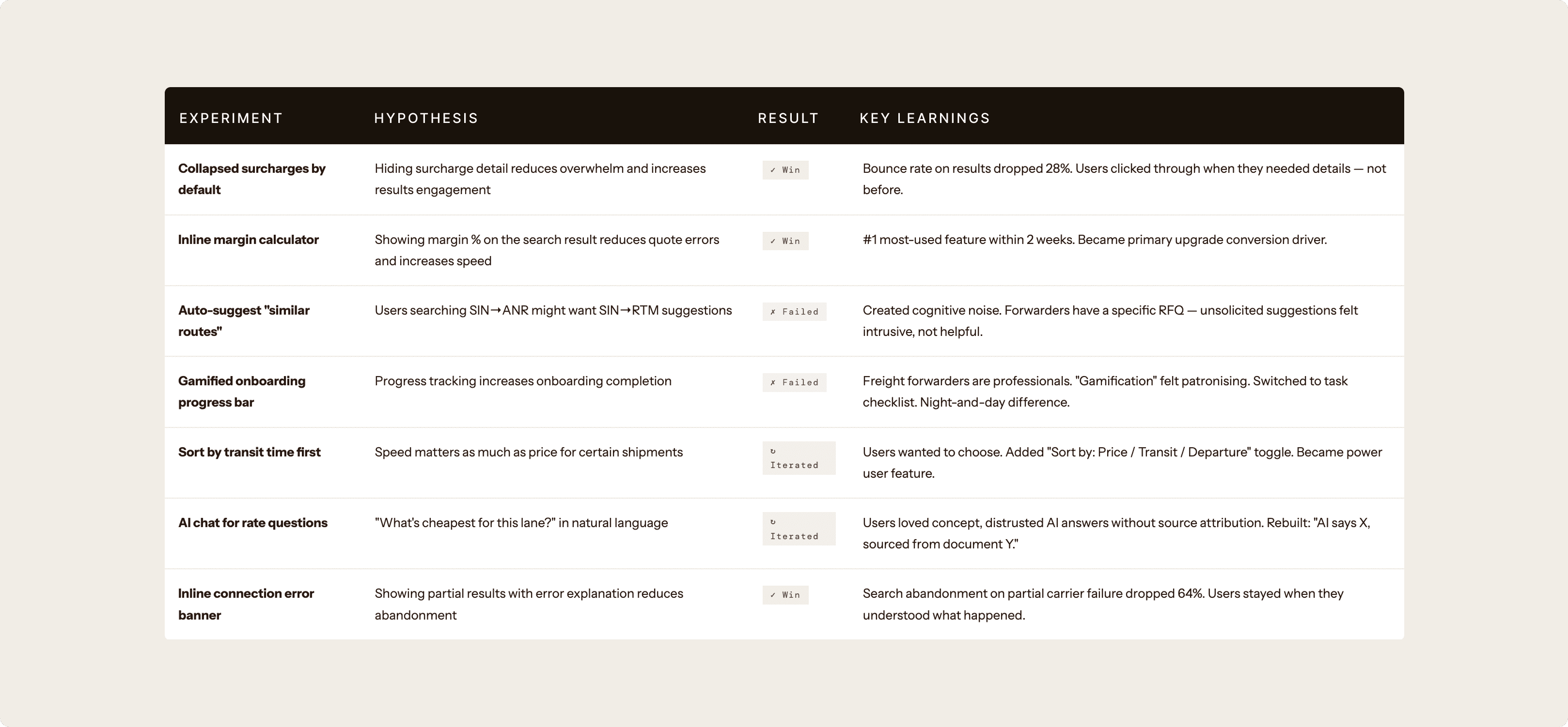This study covers the journey from pre-launch to closed beta. We tested every design decision with real freight forwarders before writing any production code.