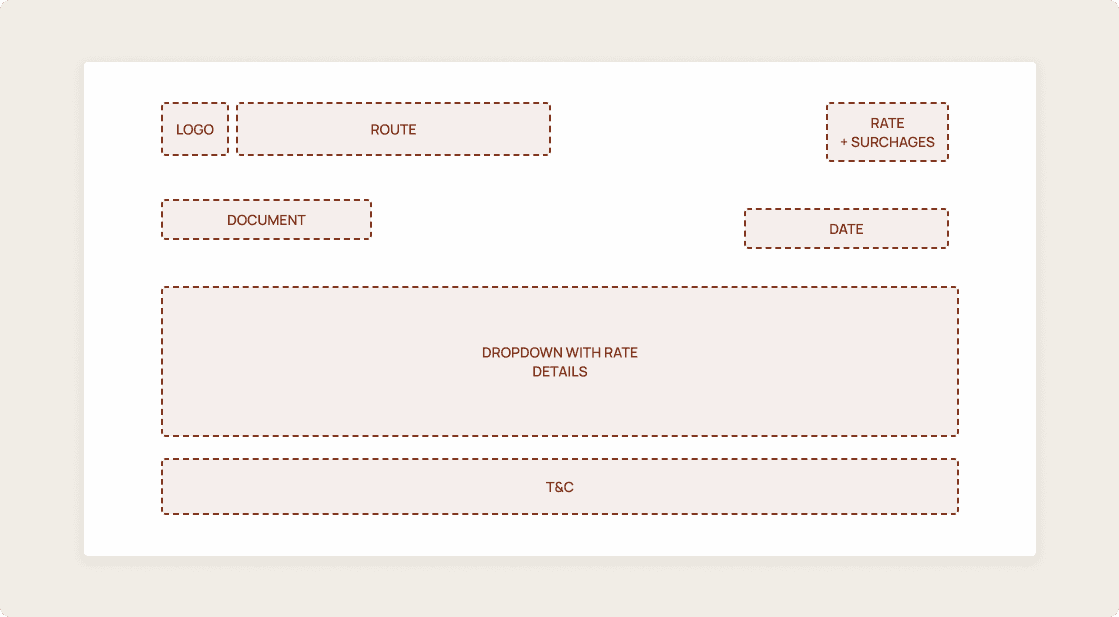 Freight quotes contain dozens of line items. Showing all of them creates overwhelm, but hiding them creates distrust. Our "Details Drawer" collapses everything behind a single click. A surcharge indicator tells the forwarder the detail is there when they need it. Including the source document name which serves as a deliberate trust signal for manual verification.