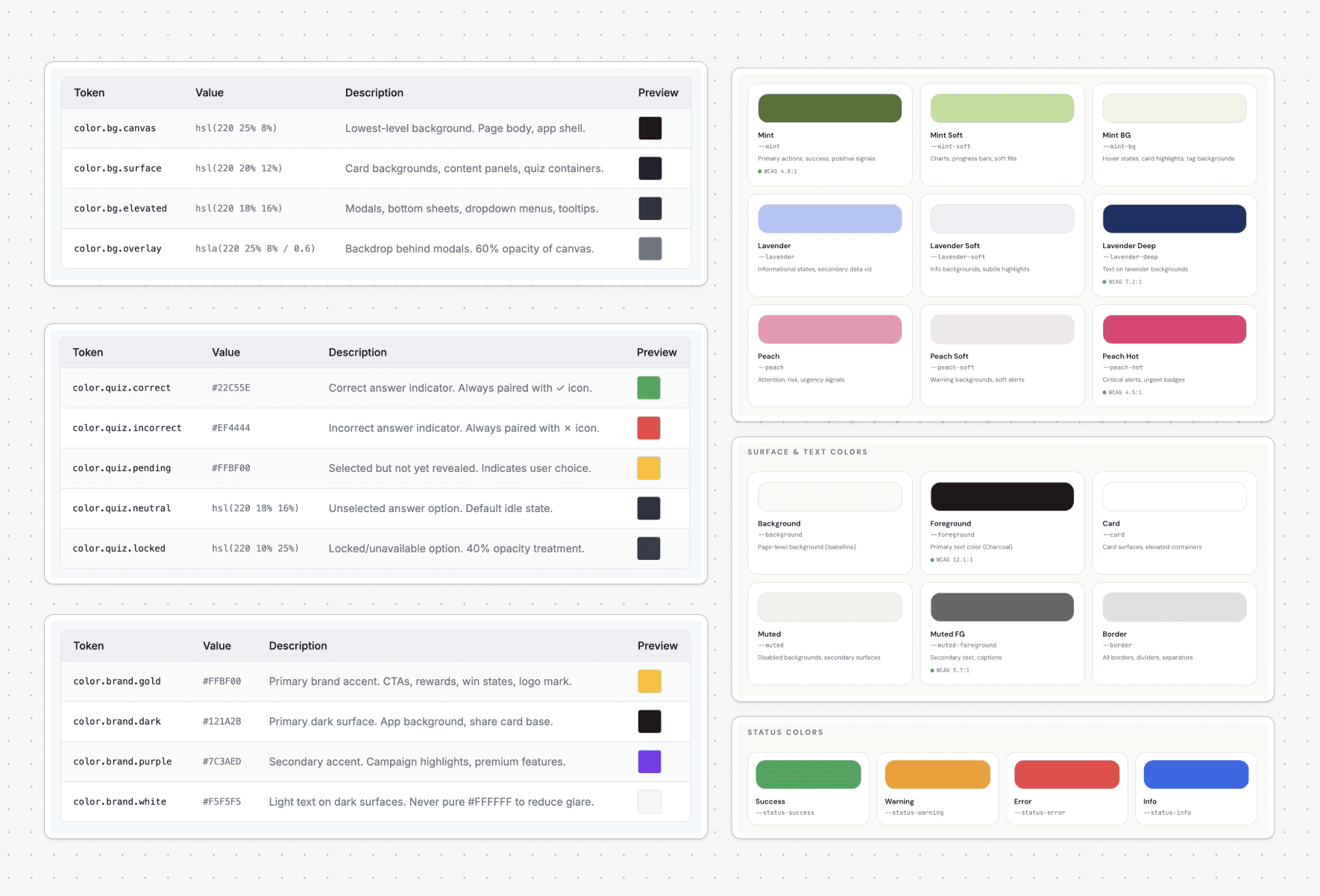 The same component library could not serve both. A high-energy celebration animation that drove social shares in the quiz would feel juvenile in an analyst dashboard. Conversely, a high-density data table that gave the AI co-pilot credibility would feel hostile in a casual pub quiz setting.
